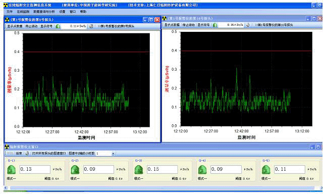 本系统以工业控制计算机作为上位机,通过由5芯屏蔽电缆线连接的RS-485通讯网络,来实时采集安装在现场的若干台REN300在线辐射安全报警仪和多个不同量程的X、γ、中子射线探头.通过对采集数据的加工处理,系统以文本数字、动态图形曲线、动态图形符号、动态颜色、报警声音的方式向管理人员和现场工作人员呈现辐射现场的剂量率信息。同时在保证系统稳定运行的前提下,系统能连续保存30个辐射探头5年以上的历史数据,为辐射环境评价提供重要的数据依据.此外系统还提供对历史的报警数分析报表、平均剂量率分析报表等统计分析功能。本系统是一套成熟的、完善的、实用的系统,已在多个地方安装并运行。